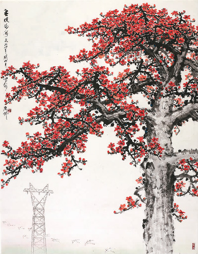 关山月践行“笔墨当随时代”的理念,深入生活,重视写生,足迹遍布塞北江南,创作出一系列反映现实生活的作品。广州艺术博物院收藏了关山月的《长征图》《钢都》《黄河颂》等名作,其中,《春暖南粤》是一幅颇具岭南特色的作品,以广州的市花木棉为主题。画作中,木棉树高大挺拔,花簇鲜艳似火,体现了南国儿女昂扬向上的精神。远处的高压输电塔为点睛之笔,现代化的元素与怒放的红棉形成呼应,象征着社会主义的火热建设。