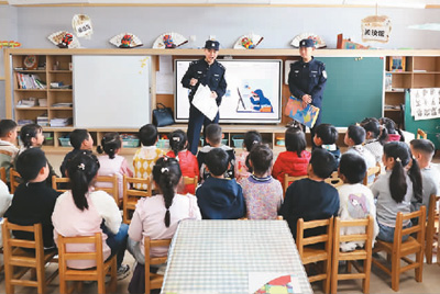 江苏省仪征市公安局城北派出所践行新时代“枫桥经验”,在辖区开展法治宣传活动,营造学法懂法用法的良好氛围。图为日前派出所民警举办宣传活动,带领小朋友们参与安全知识问答。 李远景摄