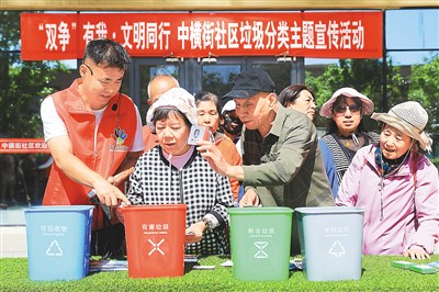 5月13日,河北省张家口市桥东区工业路街道中横街社区可回收物便民服务站开展垃圾分类知识宣传普及活动,居民通过参与各类趣味游戏,了解垃圾分类知识。图为中横街社区居民在做垃圾分类纸牌游戏。 岑 屹摄(人民视觉)