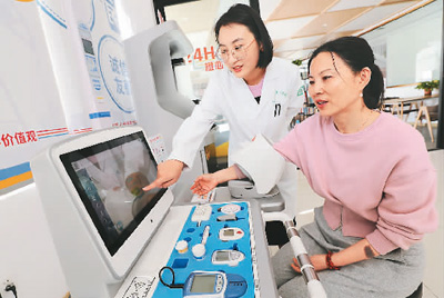 日前,山东省东营市东营区辛店街道胜凯社区智慧健康驿站,居民在医护人员指导下使用5G智能健康一体机体检。该站免费为居民提供身高、体重、体脂含量等基本身体素质项目及血压、血氧、血糖、尿酸等生化指标检测,自动生成体检报告,建立个人电子档案。