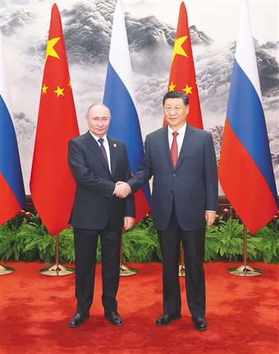 普京表示,我很高兴在就任新一届俄罗斯总统后再次访华。去年3月习近平主席也在连任后不久即对俄进行国事访问。这是我们两国的友好传统,表明双方对加强新时代俄中全面战略协作伙伴关系的高度重视。今年是中华人民共和国成立75周年,也是俄中建交75周年,值得我们共同庆祝。发展俄中关系不是权宜之计,不针对第三方,有利于国际战略稳定。俄方愿同中方持续扩大双边合作,密切在联合国、金砖国家、上海合作组织等框架内沟通协作,推动建立更加公正合理的国际秩序。