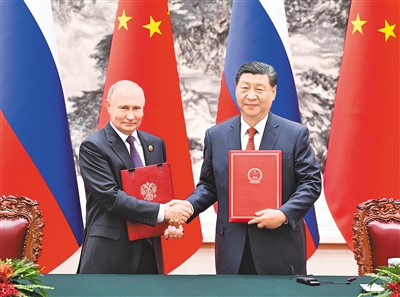 5月16日上午,国家主席习近平在北京人民大会堂同来华进行国事访问的俄罗斯总统普京举行会谈。这是会谈后,两国元首共同签署并发表《中华人民共和国和俄罗斯联邦在两国建交75周年之际关于深化新时代全面战略协作伙伴关系的联合声明》。 |