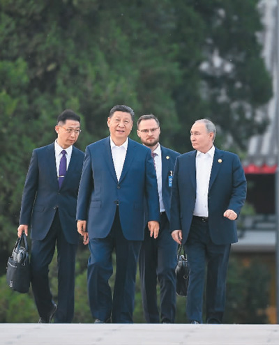 习近平在瀛台桥前迎接普京。两国元首边走边谈,看亭台楼榭,赏万物并秀。