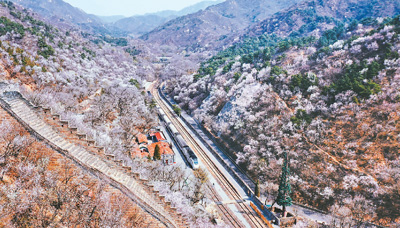 “开往春天的列车”行驶在八达岭长城脚下。 |