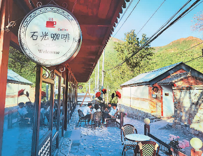 游客在石峡村的石光咖啡馆外小憩。 |