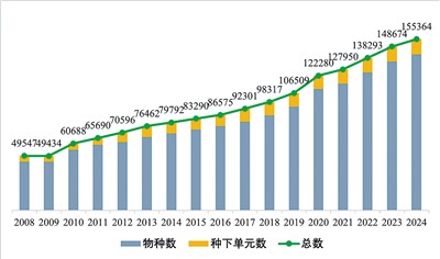 《中国生物物种名录2024版》共收录物种及种下单元155364个,其中物种141484个,种下单元13880个。相较于《中国生物物种名录2023版》,《中国生物物种名录2024版》新增6423个物种和267个种下单元,动物界新增4045个物种和159个种下单元,植物界新增358个物种和16个种下单元,真菌界新增2020个物种和92个种下单元。其中,动物界尤其是昆虫纲鞘翅目(新增3275个物种)成为本年度名录中新收录物种数量最多的类群,有效填补了中国生物物种名录的空缺。