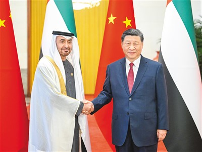 习近平指出,阿联酋是中国重要的全面战略伙伴。近年来,在我们共同引领下,中阿关系保持良好发展势头,树立了新时期中国和阿拉伯国家关系的典范。今年是中阿两国建交40周年,是中阿关系承上启下、继往开来的重要节点。中方愿同阿方一道,继续从战略高度和长远角度牢牢把握两国关系大方向,确保中阿全面战略伙伴关系始终蓬勃发展。