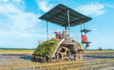 5月29日,安徽省合肥市庐江县高标准农田里,农机手正驾驶农业机械抢抓农时栽插水稻。 |