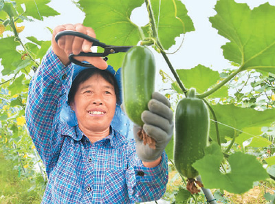 湖南省永州市江永县近年来成功创建多个粤港澳大湾区“菜篮子”产品出口备案基地,带动农民增收。图为近日在江永县潇浦镇下界头村供港蔬菜种植基地,农民采收毛瓜。