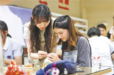 美国青少年在河北省石家庄外国语学校学习制作香囊,体验端午习俗。 本报记者 张武军摄