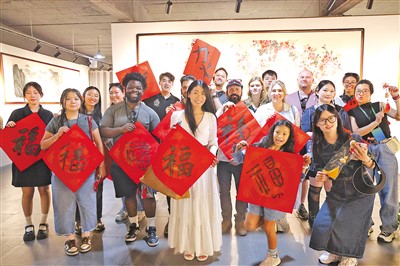 美国青少年走进山西省汾阳市贾家庄村,体验中国书法。 本报记者 张博岚摄