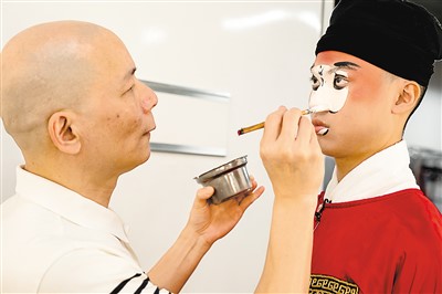 “国光”剧团演员陈清河为即将登台的学生上妆。 |