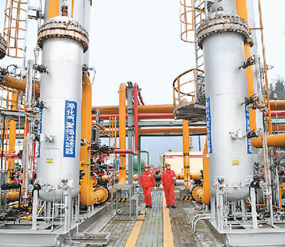 中国石化江汉油田涪陵页岩气公司自主研发网电钻机、全电压裂机组等装备工具,关键设备全部实现国产化,并着力用创新力量提高储量动用率和采收率。图为技术人员在重庆涪陵页岩气田白涛集输站对设备进行巡检。 |