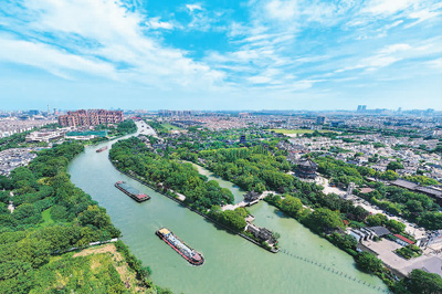 京杭大运河江苏省苏州市枫桥段景色美丽,寒山寺、枫桥、铁岭关等名胜古迹排布在大运河两岸,与周边的现代建筑相互映衬,南来北往的运输船繁忙地行驶在大运河上,彰显着经济社会发展的勃勃生机。