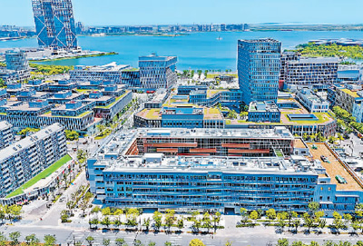 近日,位于上海市浦东新区的港城广场四期项目竣工。港城广场项目紧临滴水湖,总建筑面积约55.8万平方米,由中建八局承建,集办公、住宅、商业、酒店、文化、教育等功能于一体,是上海首个未来示范街区,未来将引入战略性新兴产业,打造人工智能产业高地。图为项目全景图。