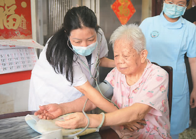 日前,广东省广州市荔湾区金花街社区卫生服务中心医生上门为92岁的陈阿婆检查身体。 |