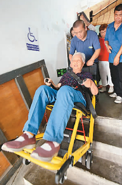 日前,北京市朝阳区青年路社区一处老旧小区内的居民在楼内体验“爬楼机”。 |