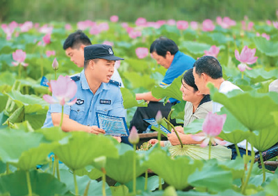 连日来,江苏省盱眙县公安局组织民警到辖区开展防诈骗宣传活动,通过互动问答、发放宣传资料等形式,向群众讲解防范非法集资、电信诈骗、金融诈骗等知识,助力守护好群众“钱袋子”。图为在盱眙县管仲镇金陡湖村,民警向采摘莲蓬的村民普及防诈骗知识。