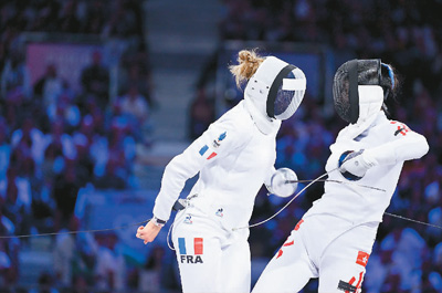 中国香港选手江旻憓(右)夺得女子个人重剑冠军。 |