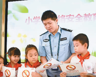 江苏省海安经济开发区实验小学校园内,民警向学生讲解未成年人网络保护知识。 |