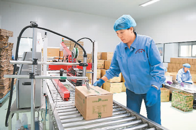 近年来,甘肃省定西市把马铃薯产业作为拓展增收渠道和支撑经济转型的优势主导产业,通过采取体系化良繁、标准化种植、精深化加工等举措,加快推动马铃薯全产业链发展。2023年,定西市马铃薯全产业产值达到238亿元。图为在定西市安定区巉口镇一家马铃薯淀粉制品企业,工人在包装马铃薯鲜粉。
