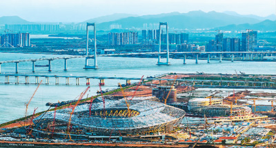2025年全运会将在粤港澳大湾区举办,在位于粤港澳大湾区“几何中心”的广州南沙,全民文化体育中心综合体建设如火如荼。该项目是集文化、旅游、体育等功能为一体的大型城市综合体,建成后可以满足国内顶级综合型赛事和国际单项赛事的举办条件,兼顾演出、展览等多功能需求。图为南沙全民文化体育中心综合体建设现场。