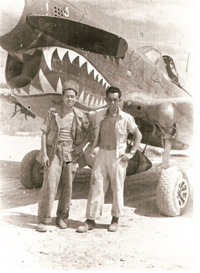 飞虎队老兵李庚申(右)与队友在战机前的合影照片。 |