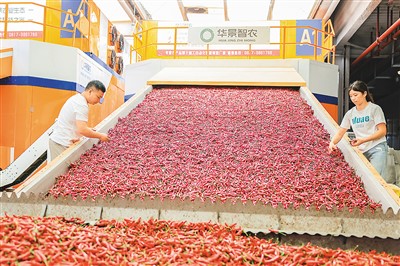 贵州省黔东南苗族侗族自治州三穗县依托自然环境等有利条件发展辣椒产业,并通过“公司+农户”发展模式,对全县辣椒种植进行全程跟踪服务和订单回收,有效增加农户收入。图为8月15日,在该县贵州惠佳食品有限公司辣椒加工车间,工人正对辣椒进行筛选、加工。