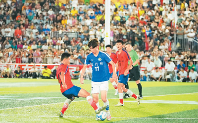 在贵州省黔东南苗族侗族自治州榕江县举办的二〇二四年贵州“村超”总决赛,党相村足球队球员与东门村足球队球员在比赛中拼抢。 |