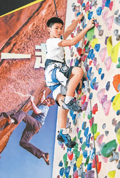 在四川省成都市一家攀岩馆内,12岁的方先旻在练习攀岩。 |