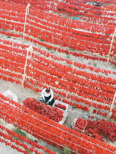 新疆巴音郭楞蒙古自治州博湖县本布图镇的农民在晾晒辣椒。 |