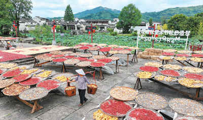 安徽省黄山市徽州区呈坎古村村民挑着农作物来晒场上晾晒。 |
