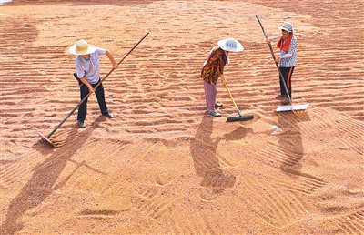 四川省遂宁市安居区石山村优讯农机服务专业合作社的晒场,村民们正在晾晒高粱。 |