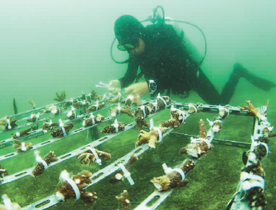 潜水员在海南陵水分界洲岛海域移植珊瑚。 |