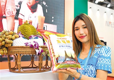 一名泰国参展商在展示泰国茉莉香米。 新华社记者 魏培全摄