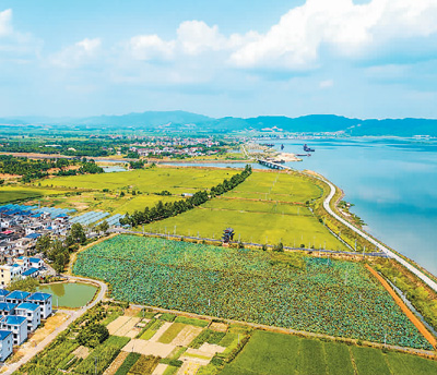 近年来,江西省吉安市积极推进美丽乡村建设。图为吉安市吉水县枫江镇,蓝天碧水、多彩田地与乡村民居相映成趣,构成一幅秀美的生态画卷。
