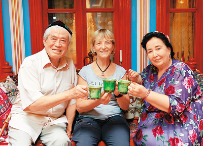 维娜和新疆喀什当地居民一起喝茶。 |