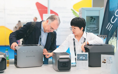 近日,2024年柏林国际消费电子展举办,今年是展会创办100周年,人工智能与可持续发展成为关注焦点。本届展会吸引了全球1800多家展商参展。其中,有不少中国企业携最新产品和技术亮相,吸引众多参观者驻足观看体验。图为工作人员为参观者介绍一款储能产品。