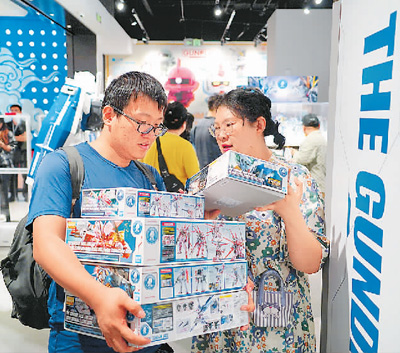 5月17日,北京高达基地旗舰店在王府井银泰in88开业,现场成品高达模型吸引不少市民参观。图为消费者正在选购。 |