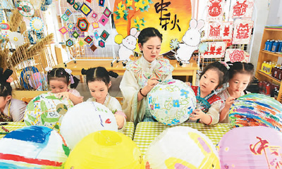 在江苏省连云港市东海县幼儿园滨河分园,老师和小朋友正在彩绘中秋花灯。 |