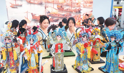 9月15日是2024年中国国际服务贸易交易会的首个公众开放日,服贸会首钢园区迎来众多参观者。在服贸会文旅服务专题展区,参展单位带来的文创产品吸引了不少观众的目光。图为观众在服贸会通州展台观看戏曲人物造型摆件。