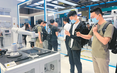 以“工业聚能 新质领航”为主题的第24届中国国际工业博览会近日在国家会展中心(上海)开幕。本届工博会设置数控机床与金属加工展、工业自动化展、节能与工业配套展、新一代信息技术与应用展、智慧能源展、新能源与智能网联汽车展、机器人展、新材料产业展和科技创新展等9大专业主题展,吸引包括台资企业在内的2600家企业参展。图为台企台达集团展位,观众在观看人机协作机器人演示。