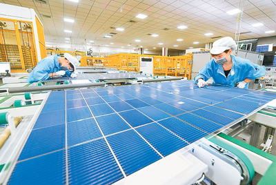 图为安徽华晟新能源科技股份有限公司的异质结光伏电池及组件工厂内,技术人员在对产品进行检测。 |