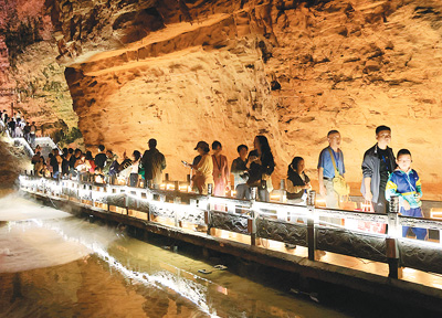 素有“世界溶洞全能冠军”美誉的湖南张家界黄龙洞景区在国庆节假期迎来旅游高峰。黄龙洞是世界自然遗产武陵源风景名胜区的重要组成部分,洞中有洞,洞中有河,数以万计的石钟乳、石笋、石柱、石花等构成“地下迷宫”,令中外游客叹为观止。图为游客游览黄龙洞。