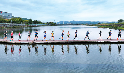 图为参赛选手奔跑在浙江省宁波市宁海县洋溪江上。