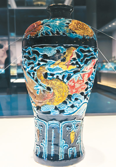这件珐华贴金镂空应龙纹梅瓶是此次展览中的精品。珐华又称“法花”,始创于元代,兴盛于明代,是以低温釉彩装饰的陶器或瓷器。珐华器工艺复杂、色彩艳丽,有“黄如金箔、紫如茄衣、蓝如水晶、绿如翡翠”之誉。