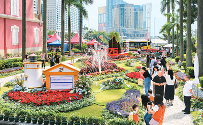 近日,澳门特区政府总部向公众开放,吸引不少居民与游客前来参观。图为游人在花卉布置前拍照“打卡”。