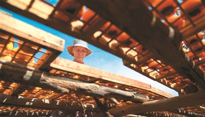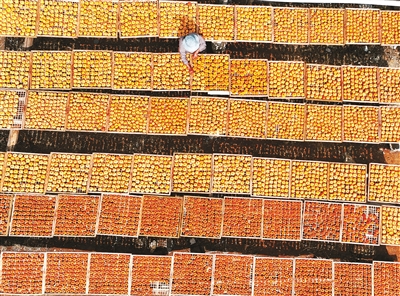 霜降过后,正是制作柿饼的好时节,广西壮族自治区桂林市恭城瑶族自治县嘉会镇秧家村村民们抢抓秋高气爽的好天气,加紧晾晒柿饼供应市场。图为该村村民在房前屋后晒柿饼。