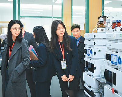 图为该活动成员一行参观石家庄四药集团药物研究院。