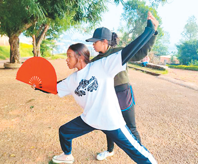 罗琪(后)正带领塔那那利佛大学孔子学院武术队的学生晨练。 |